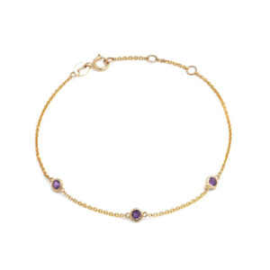 14K yellow gold, 7″ adjustable length bracelet with 3 bezel amethysts.