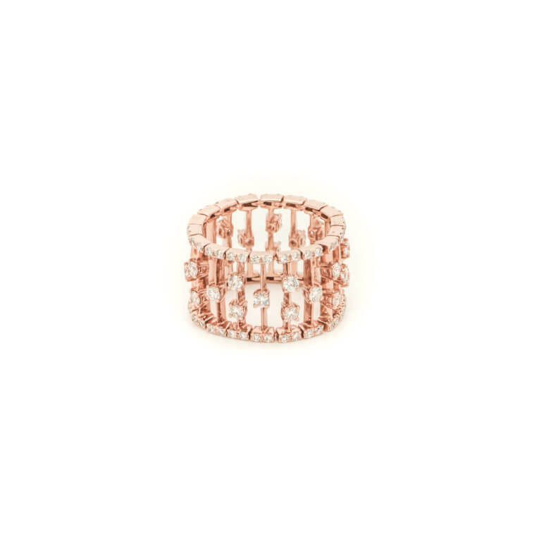 14k Rose gold cut-out thick band with round and pave Diamond details all the way around.