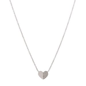 14k White gold cable chain with heart pendant, half covered in pave Diamonds.