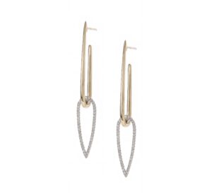 14k gold two-tone friction post and back earrings with an open Yellow Gold link on top and White Gold inverted pave Diamond, open pear shape link dangling down. Effortlessly cool.