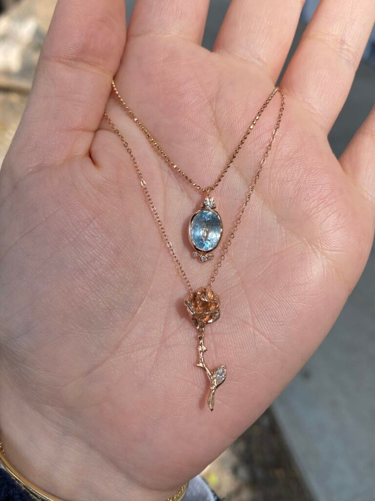 14k Rose gold ball chain with a large Aquamarine stone and diamond accents.