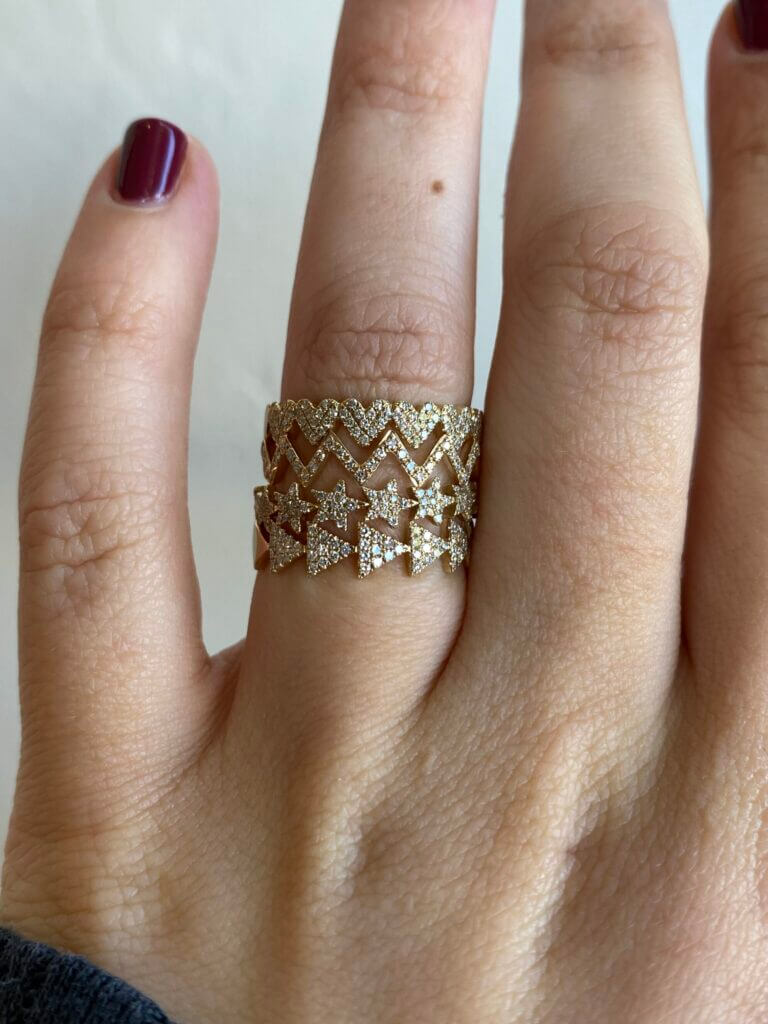 14k Yellow, Rose or White gold band with pave Diamond hearts going all the way around.