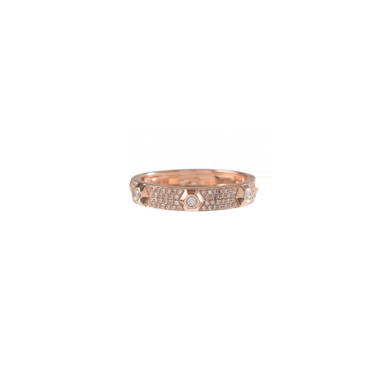 14k Yellow, Rose or White gold band with 5 screw heads, pave Diamonds and round bezel set Diamonds.
