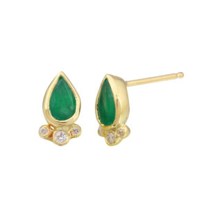 14k gold stud earring with a pear shaped emerald and triple diamonds.