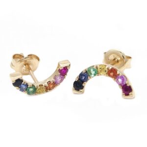 14K yellow gold multi color sapphire, ruby and green garnet arc shaped studs