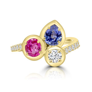 This Ruby, Blue Sapphire and Diamond Trio Ring comes in 18K yellow gold. The stones on the ring include both a 1.47ct ruby and blue sapphire and a .39ct diamond.