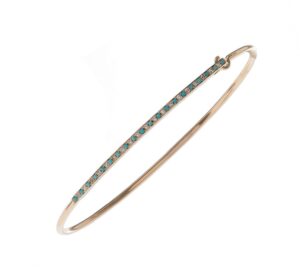 14k Yellow gold wire bangle with a single row of alternating round Diamonds and Turquoise cabochons. With a small hook clasp closure in front, this bracelet is effortless, dainty and beautiful.