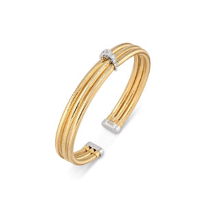Triple row 18k yellow gold snake chain open cuff with pave diamond stainless steel swoosh accent 0.13ctw